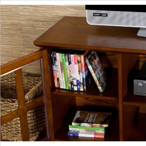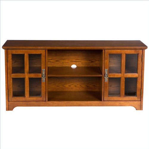A touch of rustic charm with contemporary styling makes this mission oak media stand a perfect choice for your home media collection. Making room for up to a 50" flat panel TV is just the start. The large center storage and glass paned side storage a...
