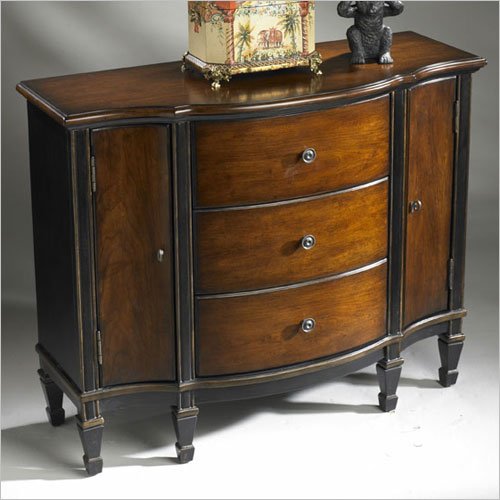 Hand painted finish on selected solid hardwoods and wood products. Choice cherry veneer on top, drawer fronts, doors and sides. Three felt lined drawers with dovetail construction. Two doors. Antique brass finished hardware. 39 in. W x 16 in