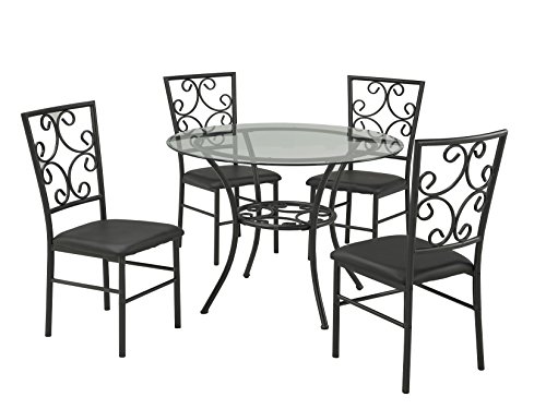 This five-piece dining set will appeal to those who appreciate fine details and classic elegance. Curl-tailed design accents the sturdy metal chair frames and is also featured in the table’s center frame. The glass tabletop keeps your space feeling...