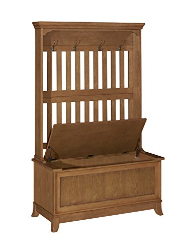 An easy storage solution, the oakdale hall tree adds to fashion and function to your home décor. This multi-functional piece has a moulding on the top shelf, four mounted hooks, and a hinged storage seat. The warm oak finish sets off the open slat b...