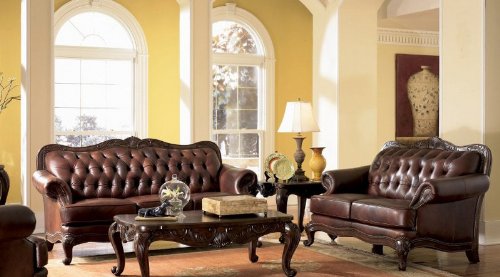 Bring the charms of a parlor setting to your space with this romantically bold pair. Victorian styling is beautifully recreated in the flowing lines of this sofa and love seat. Leather upholstery is highlighted with button tufting, rolled arms and ca...