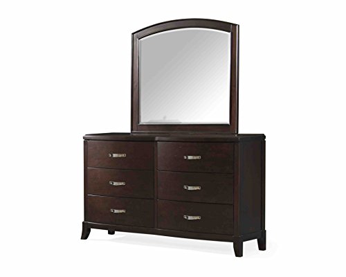 - Rich Espresso Finish; sleek silver handles; uniquely arched mirror frame;
