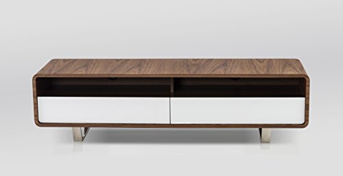 Gramercy TV unit there's something alluring about warm walnut veneer when contrasted with white high gloss. Striking appeal, plenty of storage, and simplistic design that speaks in volumes.