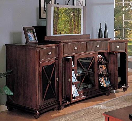 Power TV lift. Five doors. Speaker covers. Made from hardwood and wood veneers. Made in China. No assembly required. 99 in. W x 25 in. D x 42 in. H (700 lbs.).